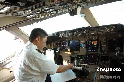 五月十三日,深航旗下中德合資翡翠航空大型貨機747-400/JI7451受命運輸?shù)卣鹁葹?zāi)物資,從天津?qū)揖葹?zāi)帳篷等二百四十八噸物資專機緊急運往地震災(zāi)區(qū)。圖為深航副總裁劉清貴做飛行前準(zhǔn)備。中新社發(fā) 陳文 攝