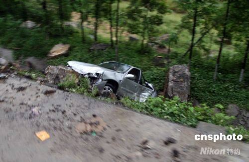圖:通往北川老縣城公路旁一轎車被滾石砸扁