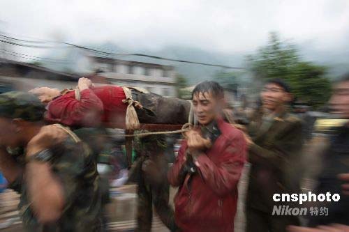 5月13日,中國(guó)空降兵6500多名官兵分別乘坐空軍遠(yuǎn)輸機(jī)奔赴四川重災(zāi)區(qū),分五路兵力,分別在什邡、德陽(yáng)、茂縣、等重災(zāi)區(qū)展開救援。圖為解放軍士兵成功救出一名傷者。中新社發(fā) 譚超 攝