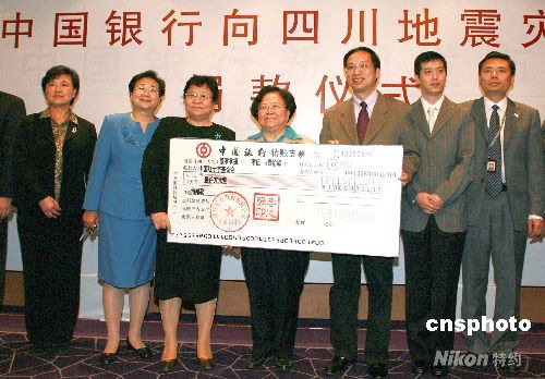 5月14日,中國(guó)銀行在北京舉行捐贈(zèng)儀式,向中國(guó)紅十字總會(huì)捐款1000萬(wàn)元人民幣,用于汶川地震災(zāi)區(qū)援救工作。中國(guó)紅十字總會(huì)會(huì)長(zhǎng)彭佩云代表協(xié)會(huì)接受捐款。至此,中國(guó)銀行集團(tuán)已向?yàn)?zāi)區(qū)捐款近2300萬(wàn)元人民幣,是目前對(duì)此次抗震救災(zāi)捐款數(shù)額最大的企業(yè)。中新社發(fā) 廖文靜 攝