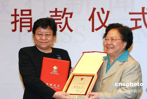 5月14日,中國銀行在北京舉行捐贈(zèng)儀式,向中國紅十字總會(huì)捐款1000萬元人民幣,用于汶川地震災(zāi)區(qū)援救工作。中國銀行副行長張燕玲(左)接受捐款證書并在發(fā)布會(huì)上介紹:中國銀行各一級分行、直屬分行已為此次抗震救災(zāi)開啟緊急“綠色通道”,免除全部捐款的匯款手續(xù)費(fèi)。中新社發(fā) 廖文靜 攝