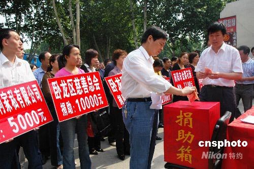 5月14日上午,河南省南陽市臥龍區(qū)組織的“情系四川汶川地震災(zāi)區(qū)捐助活動(dòng)”現(xiàn)場,社會(huì)各界群眾在捐款箱前排成了長隊(duì)。該區(qū)各企業(yè)和干部群眾大力發(fā)揚(yáng)“一方有難,八方支援”的精神,通過各種形式向?yàn)?zāi)區(qū)人民伸出援助之手,為災(zāi)區(qū)生產(chǎn)生活的重建貢獻(xiàn)力量。中新社發(fā) 熊運(yùn)彬 攝