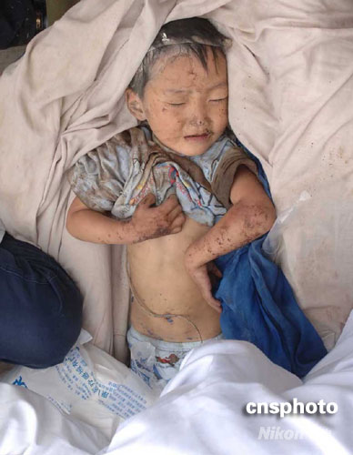 5月14日,四川省北川縣一名從廢墟中救出的兒童被安置在臨時(shí)搭建的醫(yī)療點(diǎn)內(nèi),接受簡單治療后被送往臨近的大城市。北川縣是“5.12”四川大地震中受災(zāi)最嚴(yán)重的地區(qū)之一。中新社發(fā) 鄒憲 攝