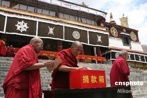 5月14日,在拉薩暴力事件發(fā)生兩個月之際,藏傳佛教西藏三大寺廟之一的拉薩哲蚌寺四百多僧人齊聚措欽大殿,將為四川汶川地震災區(qū)民眾舉行祈福主題法會,并且,該寺僧眾踴躍為災區(qū)捐款,當場募集善款三萬八千余元人民幣。中新社發(fā) 柳俊武 攝