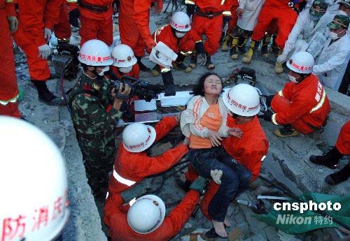5月14日,重慶消防抗震救災(zāi)突擊隊(duì)官兵成功救出一名幸存者。13日晚19時(shí)30分,重慶消防抗震救災(zāi)突擊隊(duì)首批力量200名官兵歷經(jīng)12小時(shí)的長(zhǎng)途奔襲,順利抵達(dá)北川中學(xué),并全面展開(kāi)救援。截至14日下午19時(shí),重慶消防抗震救災(zāi)突擊隊(duì)首批力量已成功從廢墟中救出22條生命。中新社發(fā) 萬(wàn)明 攝