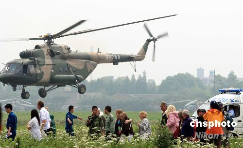 圖:外國游客在四川災(zāi)區(qū)被軍用直升機救出