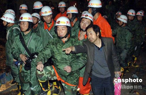 四川汶川縣5月12日發(fā)生7.8級(jí)地震后,北川縣北川中學(xué)受到極大的迫害,將近三千名的學(xué)生中僅有一半學(xué)生生存,另一部分學(xué)生因樓房倒塌而遇難或受傷。抗震消防隊(duì)員不顧艱險(xiǎn)連續(xù)工作,利用不同工具挖掘被壓人員,并及時(shí)成功搶救出一批學(xué)員。圖為綿陽(yáng)一位建筑設(shè)計(jì)人員輔助施工人員進(jìn)行搶險(xiǎn)救災(zāi)。中新社發(fā) 鄒憲 攝