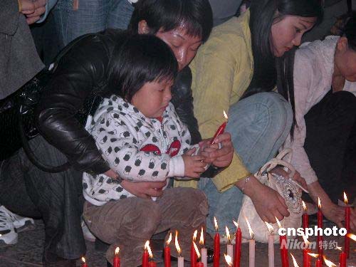 五月十四日晚,昆明市數(shù)百群眾自發(fā)來(lái)到市中心的東風(fēng)廣場(chǎng),點(diǎn)燃蠟燭,為災(zāi)區(qū)群眾祈禱。圖為一位小女孩在家長(zhǎng)的幫助下點(diǎn)燃蠟燭為災(zāi)區(qū)祈福。中新社發(fā) 史廣林 攝