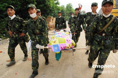 解放軍官兵在北川茅壩小學(xué)搜救出三名幸存小學(xué)生
