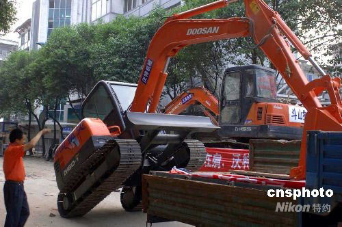 2008年5月15日,地震災(zāi)區(qū)都江堰市危樓排險(xiǎn)工作正在進(jìn)行中。目前來(lái)自成都市企業(yè)的志愿抗震救災(zāi)隊(duì)伍攜帶大型機(jī)械車輛開(kāi)進(jìn)都江堰市區(qū),與解放軍部隊(duì)一起展開(kāi)危樓居民區(qū)的排險(xiǎn)、救災(zāi)、防疫工作。圖為成都市一企業(yè),派數(shù)量可觀的大小挖掘機(jī)和破損機(jī)進(jìn)入江堰市危樓疏散區(qū)。汶川7.8級(jí)地震,給都江堰市帶來(lái)巨大破壞。目前危樓居民區(qū)疏散、安置工作已展開(kāi),取得一定成果。中新社發(fā) 鄒憲 攝