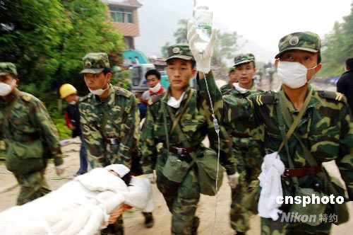 五月十六日晨,解放軍某部官兵在地震重災(zāi)區(qū)北川縣茅壩小學(xué)搜救出三名小學(xué)生,這已是地震災(zāi)難進入第五天在廢墟里搜救出的幸存者。中新社發(fā) 陳文 攝