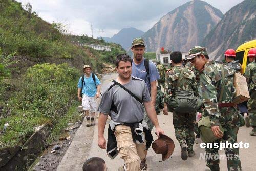 圖:映秀鎮(zhèn)受困外國(guó)游客在前往安全地點(diǎn)
