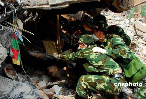 5月15日,在四川省綿竹市漢旺鎮(zhèn)地震重災(zāi)區(qū),數(shù)千名武警、消防官兵與時間賽跑,盡可能地搶救每一名被困的災(zāi)民。中新社發(fā) 陳進 攝