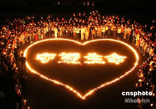 5月15日晚,山西省太原市雙語實驗小學400多名師生在校園操場上,將3000余支蠟燭擺成一個巨大的“心”和“守望生命”四個字,為四川災(zāi)民祈福。中新社發(fā) 華山大 攝