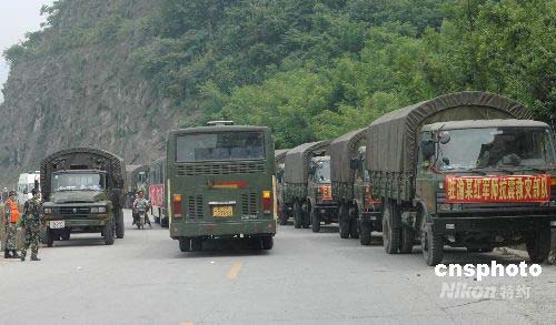 遵照中央軍委主席胡錦濤的命令,5月16日,解放軍部隊官兵繼續(xù)前往四川汶川“5.12”大地震各重災區(qū)搶險救災。圖為濟南部隊、駐渝某紅軍師等車隊。中新社發(fā) 肖龍聯 攝