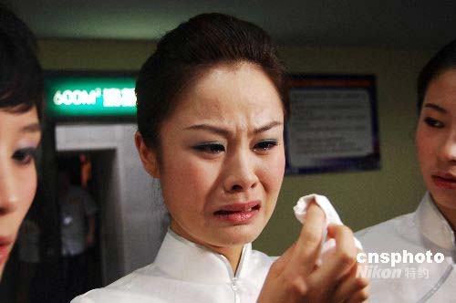 十七日下午,二00八中國(guó)新空姐招募大匯廣州賽區(qū)舉行晉級(jí)賽,一位來自四川災(zāi)區(qū)的選手說起家鄉(xiāng)的災(zāi)情不禁淚流滿面。中新社發(fā) 柯小軍 攝