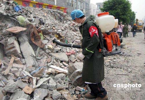 五月十七日,是汶川地震發(fā)生時間第六天,地震災(zāi)區(qū)都江堰市最大的市場荷花池市場已開始用大型挖掘機、裝載機清理倒塌的樓房和廢墟,并有專業(yè)人員進行防疫消毒。中新社發(fā) 周丹鈺 攝