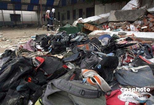 圖:疾控人員對(duì)殘留的書包噴灑消毒藥