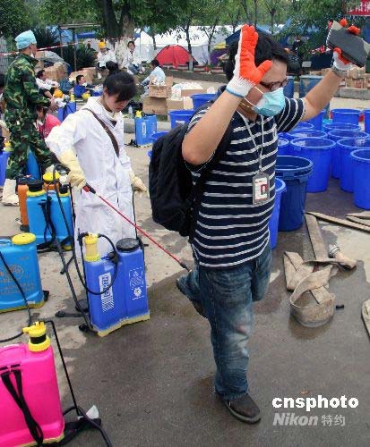 5月17日,四川綿竹漢旺地震災(zāi)區(qū)衛(wèi)生防疫人員展開消毒防疫工作,圖為衛(wèi)生員為在災(zāi)區(qū)采訪的記者消毒。中新社發(fā) 齊彬 攝