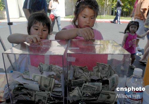 當(dāng)?shù)貢r(shí)間五月十七日,四川大地震發(fā)生后的第一個(gè)周末,在洛杉磯地區(qū)工作生活的普通華人華僑頂著華氏一百度的高溫走上街頭,為遠(yuǎn)隔萬里的災(zāi)區(qū)同胞默默捐出一張張現(xiàn)金和支票。短短六個(gè)小時(shí)的街頭募捐活動(dòng)共籌得四十萬美元。圖為小姐妹將積攢的零花錢全部捐獻(xiàn)給地震災(zāi)區(qū)。中新社發(fā) 張煒 攝