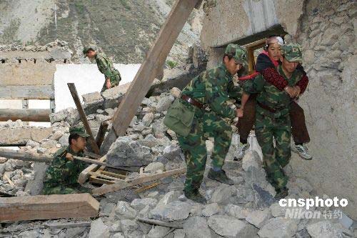 5月18日上午9時50分,成都軍區(qū)駐渝某集團(tuán)軍搜救小分隊在四川省茂縣南興鎮(zhèn)救出55歲受傷婦女茍世英。中新社發(fā) 高效文 攝