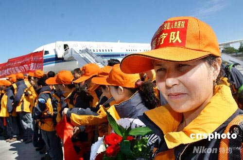5月18日下午,由新疆多家醫(yī)療機(jī)構(gòu)醫(yī)護(hù)專家組成首批抗震救災(zāi)醫(yī)療防病救援隊(duì)從新疆烏魯木齊國(guó)際機(jī)場(chǎng)乘專機(jī)前往四川汶川地震災(zāi)區(qū)實(shí)施醫(yī)療救助和疫情防御工作,同時(shí)30噸救援所需的藥品和物資也隨救援隊(duì)一同被運(yùn)往地震災(zāi)區(qū)。據(jù)了解,新疆首批抗震救災(zāi)醫(yī)療防病救援隊(duì)共計(jì)90人,由維、漢、哈、回等各族醫(yī)護(hù)工作者組成,其中女性24名。當(dāng)日上午7輛救援工作車已從烏魯木齊出發(fā),趕向四川災(zāi)區(qū),預(yù)計(jì)54小時(shí)即可到達(dá)災(zāi)區(qū)。中新社發(fā) 劉新 攝