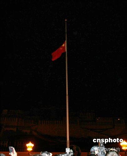 五月十九日凌晨零點(diǎn)時(shí)分,西藏自治區(qū)在布達(dá)拉宮廣場舉行降半旗儀式,向“五·一二”四川大地震死難同胞致哀,此舉為新中國成立以來,布達(dá)拉宮廣場首次為死難普通民眾降半旗。中新社發(fā) 柳俊武 攝