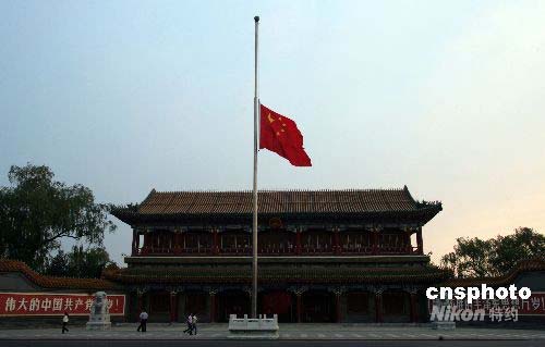 5月19日清晨,北京新華門下半旗,哀悼5·12汶川大地震中遇難同胞。中國國務(wù)院作出決定,5月19日至21日為全國哀悼日。在此期間,全國和各駐外機(jī)構(gòu)下半旗志哀,停止公共娛樂活動(dòng),中國外交部和中國駐外使領(lǐng)館設(shè)立吊唁簿。5月19日14時(shí)28分起,全國人民默哀3分鐘,屆時(shí)汽車、火車、艦船鳴笛,防空警報(bào)鳴響。中新社發(fā) 張宇 攝