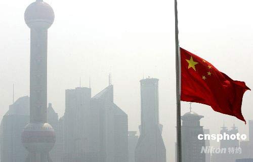 5月19日全國(guó)哀悼日,上海下半旗沉痛哀悼四川地震遇難同胞。為表達(dá)全國(guó)各族人民對(duì)四川汶川大地震遇難同胞的深切哀悼,國(guó)務(wù)院決定,2008年5月19日至21日為全國(guó)哀悼日。在此期間,全國(guó)和各駐外機(jī)構(gòu)下半旗志哀,停止公共娛樂(lè)活動(dòng),外交部和中國(guó)駐外使領(lǐng)館設(shè)立吊唁簿。5月19日14時(shí)28分起,全國(guó)人民默哀3分鐘,屆時(shí)汽車、火車、艦船鳴笛,防空警報(bào)鳴響。中新社發(fā) 湯彥俊 攝
