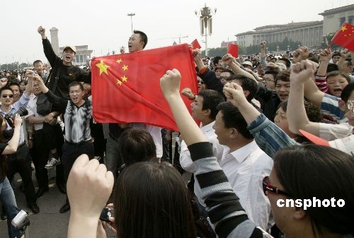 2008年5月19日14時31分,默哀結(jié)束后,在北京天安門廣場的近萬名民眾仍然聚集在一起,手持國旗和菊花,高喊:“加油四川!加油中國!”中新社發(fā) 李剛 攝