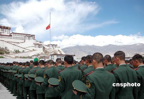 五月十九日下午二時二十八分,來自社會各界的人民群眾、武警官兵上萬人,匯集布達(dá)拉宮廣場舉行莊重的肅立默哀儀式,哀悼四川地震中遇難者。中新社發(fā) 周波 攝