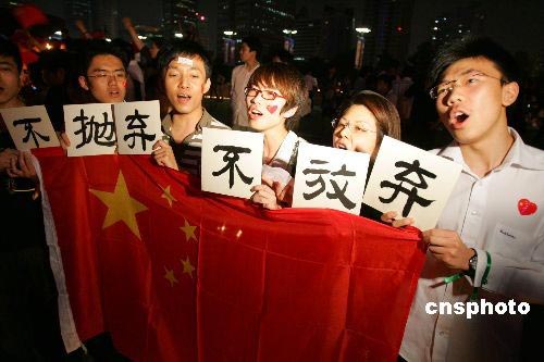 5月19日晚,數(shù)千名上海市民自發(fā)前往人民廣場,點亮十萬支蠟燭為四川地震遇難者祈福。眾多青年在現(xiàn)場高唱國歌,為中國加油,為四川加油。中新社發(fā) 湯彥俊 攝