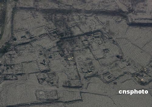 五月十九日,從空中可見汶川大地震造成泥石流掩埋的一個(gè)村莊。中新社發(fā) 賈國榮 攝