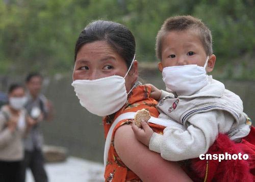 四川地震災區(qū)中的一對母子。 中新社發(fā) 曾憲平 攝
