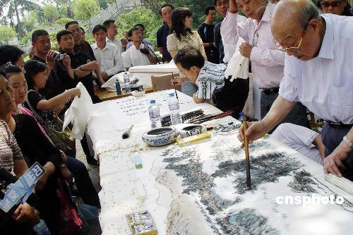 五月二十日,書畫家在鄭州紫荊山公園作畫賑災(zāi)。當(dāng)日,由河南省慈善總會(huì)、省文化廳主辦,河南省嵩陽書畫院承辦的“翰墨丹青獻(xiàn)愛心”大型賑災(zāi)書畫義賣活動(dòng)在此舉行,所得善款將全部轉(zhuǎn)至四川地震災(zāi)區(qū)。 中新社發(fā) 李志全 攝