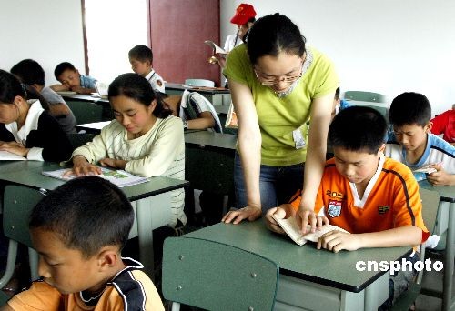5月19日,來自地震重災區(qū)的孩子在四川省成都市新都區(qū)“愛心學!钡恼n堂上接受老師輔導。全國首所專門為地震重災區(qū)孩子開辦的“愛心學!,18日上午在四川省成都市新都區(qū)新繁鎮(zhèn)正式開課。首批就讀的166名孩子,分別來自彭州、都江堰、綿竹等重災區(qū),有的孩子在震災中失去了父母。新都區(qū)從各個學校抽調了近20名經驗豐富、有敬業(yè)精神和愛心的教師任課,并給學校安排了2名有資質的優(yōu)秀心理健康輔導老師。