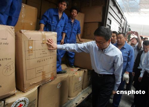 5月20日,上海市市長韓正親臨火車站指揮調(diào)運(yùn)物資赴川救災(zāi)。截止到19日,上海連續(xù)緊急調(diào)集并運(yùn)往災(zāi)區(qū)抗震救援物資達(dá)1127噸,價(jià)值2954.43萬元。中新社發(fā) 湯彥俊 攝