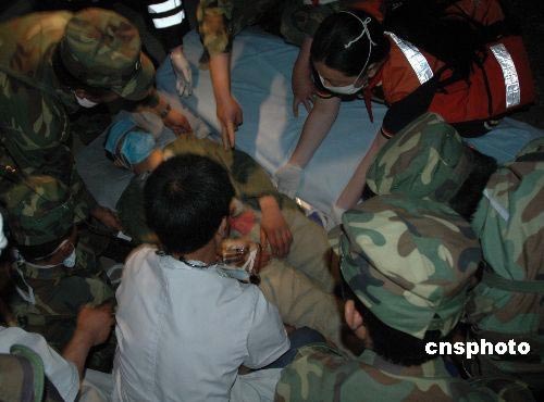 5月20日凌晨4時,在云南駐滇某部劉清泉副師長等百名戰(zhàn)士護送下,被埋172小時的安縣雎水道禧村六組的礦工彭國華成功獲救,創(chuàng)造了生命的奇跡。中新社發(fā) 王荔 周保全 攝