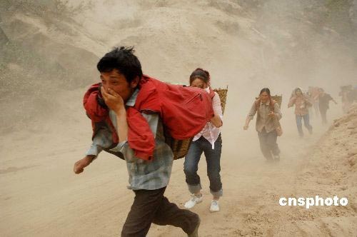 汶川重災區(qū)仍然余震,崩塌、滑坡、泥石流等地質(zhì)災害險情不斷,被困受災群眾由搶險部隊協(xié)助安全撤離。圖為5月20日,汶川受災群眾快速通過山體滑坡險段。中新社發(fā) 陳文 攝