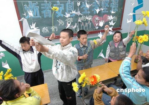 5月21日是全國哀悼日最后一天,遼寧省錦州市古塔區(qū)培智學(xué)校的300名智障小學(xué)生用雙手疊制了1000只紙鶴,還買來黃菊花悼念地震逝去的小朋友,放飛心愿,為災(zāi)區(qū)人民祈福。中新社發(fā) 李鐵成jz 攝