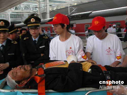 5月22上午,運送著243名四川地震災(zāi)區(qū)傷員的云南愛心專列從江油抵達昆明火車站。圖為志愿者用擔(dān)架護送一位重傷病者上救護車。中新社發(fā) 保旭 攝