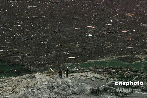 汶川大地震發(fā)生以后,水利地質(zhì)人員乘直升飛機(jī)降落到北川唐家山堰塞湖,檢測(cè)水位上漲和污染危情,嚴(yán)密監(jiān)測(cè)由于一座大山的崩塌堵塞河道形成的堰塞湖。中新社發(fā) 賈國榮 攝