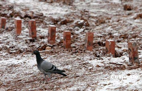 5月22日上午,一只灰鴿從遠(yuǎn)處飛來,落在四川省什邡市洛水鎮(zhèn)李冰村西北的山坡上,這里埋葬了108名“5.12”地震遇難者,他們的墓碑用磚代替,墓碑上沒有名字,上面只有一個(gè)數(shù)字編號(hào)。 灰鴿久久佇立在這片灑滿石灰粉的墓地,良久后,它沿著第二排磚碑向南緩緩踱去,頭頸轉(zhuǎn)向墓碑……走到盡頭,然后它又側(cè)身轉(zhuǎn)向第一排磚碑,良久……當(dāng)記者慢慢地輕輕接近它時(shí),它并沒有飛起,微微地昂起頭,少頃,“咕咕”地叫幾聲,回望了一眼墓地,飛走了……中新社發(fā) 張曉理 攝