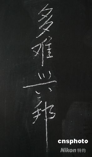 溫家寶總理5月23日在看望臨時(shí)安置在四川綿陽長虹培訓(xùn)中心北川中學(xué)高三同學(xué)時(shí),用粉筆在黑板上寫下的“多難興邦”四個(gè)大字。中新社發(fā) 蒲滔 攝
