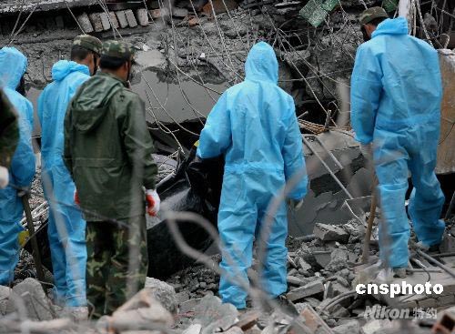 武警官兵五月中旬開(kāi)始清理汶川大地震受災(zāi)嚴(yán)重的映秀鎮(zhèn),他們?cè)阡隹谥袑W(xué)每一次挖掘出來(lái)遇難學(xué)生的遺體時(shí),都沉痛默哀。中新社發(fā) 賈國(guó)榮 攝