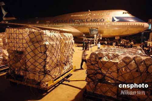 滿載各類救災物資、從美國起飛的一架波音七四七貨運專機,于24日晚11時50分飛抵成都雙流國際機場。這架由美國著名慈善機構撒瑪利亞救援會包租的專機,是截至目前政府渠道之外運送救災物資到四川災區(qū)的首架國外民間包機。中新社發(fā) 陳文 攝