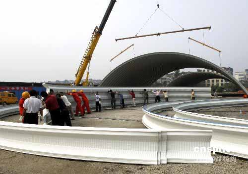 24日,由成都市新都區(qū)組織上千名工人,投資4000萬元,在都江堰市觀鳳小區(qū)為受災群眾援建的安置房落成,2000受災群眾找到了新家。精心的設計,人性化的布置,受到了當?shù)厥転娜罕姷呐氖址Q贊。圖為工人們正在搭建鋼制拱型餐廳。中新社發(fā) 劉亮 攝