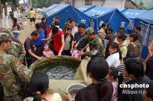 5月25日,解放軍為四川地震重災區(qū)北川縣陳家壩民眾送來干凈的飲用水,民眾高興地領水。中新社發(fā) 周群 攝