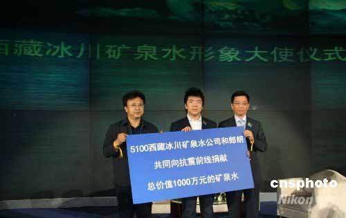 圖:郎朗與某企業(yè)共同為災(zāi)區(qū)捐千萬元礦泉水