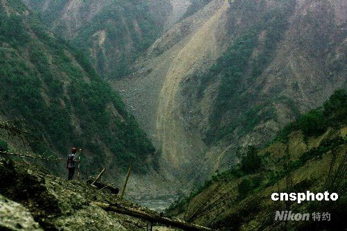 圖:科技人員塌方中測量唐家山堰塞湖